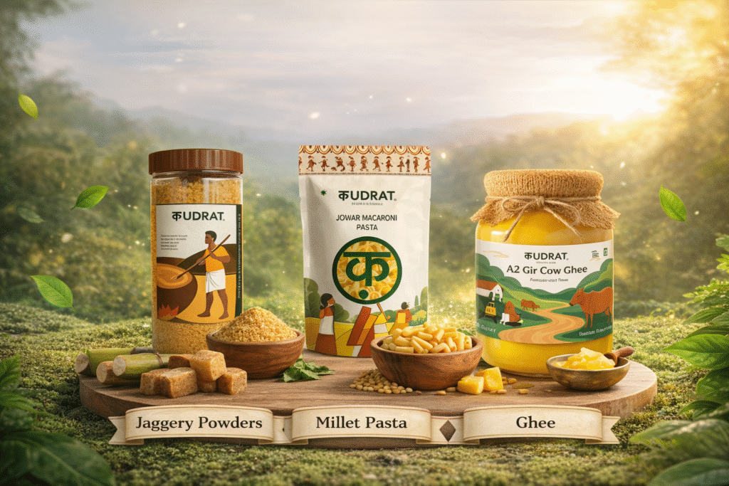 Kudrat Organic and Living Essentials brings you nature's sweetness with Raw Sugar, Jaggery Powder, and Jaggery Cubes.
